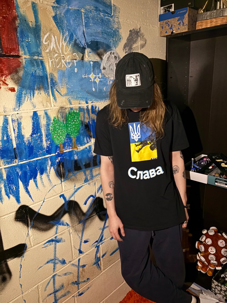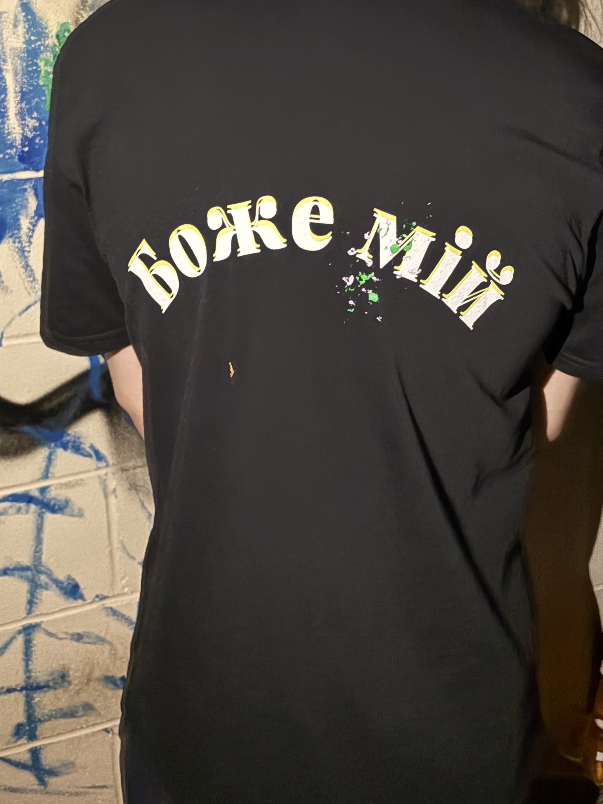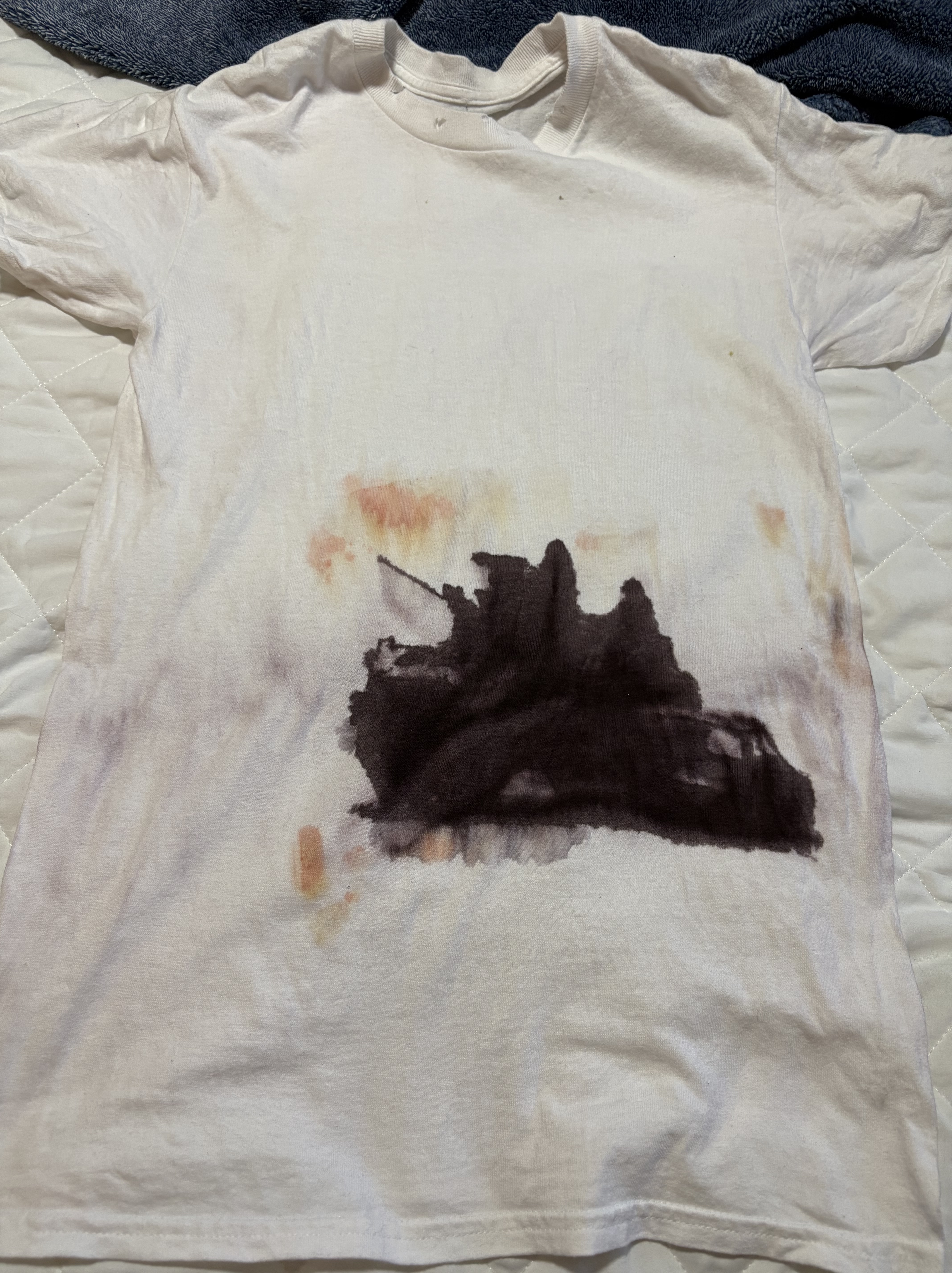 Ink and acrylic paint mixed with detergent. Cotton T-Shirt.